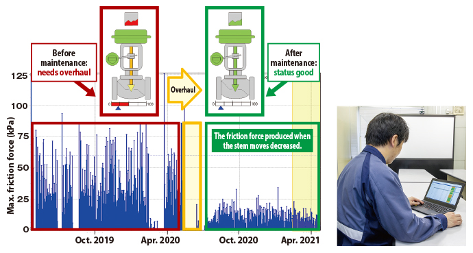 In 2017, the plant began using a service in which Azbil analyzes valve condition using the data collected by Valstaff and reports the diagnostic results every six months. In 2018, using the data from this service, the plant started select-ing valves to be overhauled*1 when planning regular maintenance.*2 Moreover, the plant compared the data provided by Azbil with the actual degree of deterioration found during inspection to check the credibility of the service.