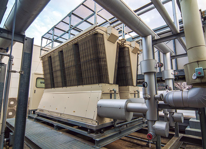 工場屋上に置かれた空冷ヒートポンプチラー。今回の施策で最新の高効率機にリプレースされた。