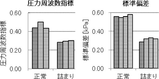 図5に得られた圧力周波数指標と標準偏差を示す。圧力周波数指標は正常時に0.435~0.502だったのに対し,模擬詰まり時は0.285~0.301となった。このように,導圧管の詰まりで圧力周波数指標が小さくなることが確認できた。一方,標準偏差は正常時が0.55~0.58kPa,模擬詰まり時は0.29~0.33kPaとなり,やはり詰まりによって小さくなることが確認できた。
