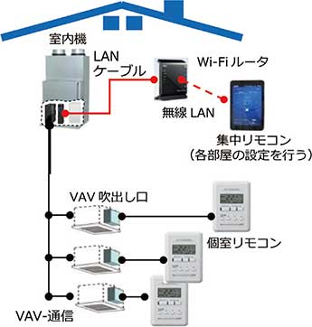 従来のシステムにWi-Fiルータを追加し,市販のAndroidタブレットを専用化した「集中リモコン」と無線LANを接続する構成とし,各部屋の設定を行うことができる。