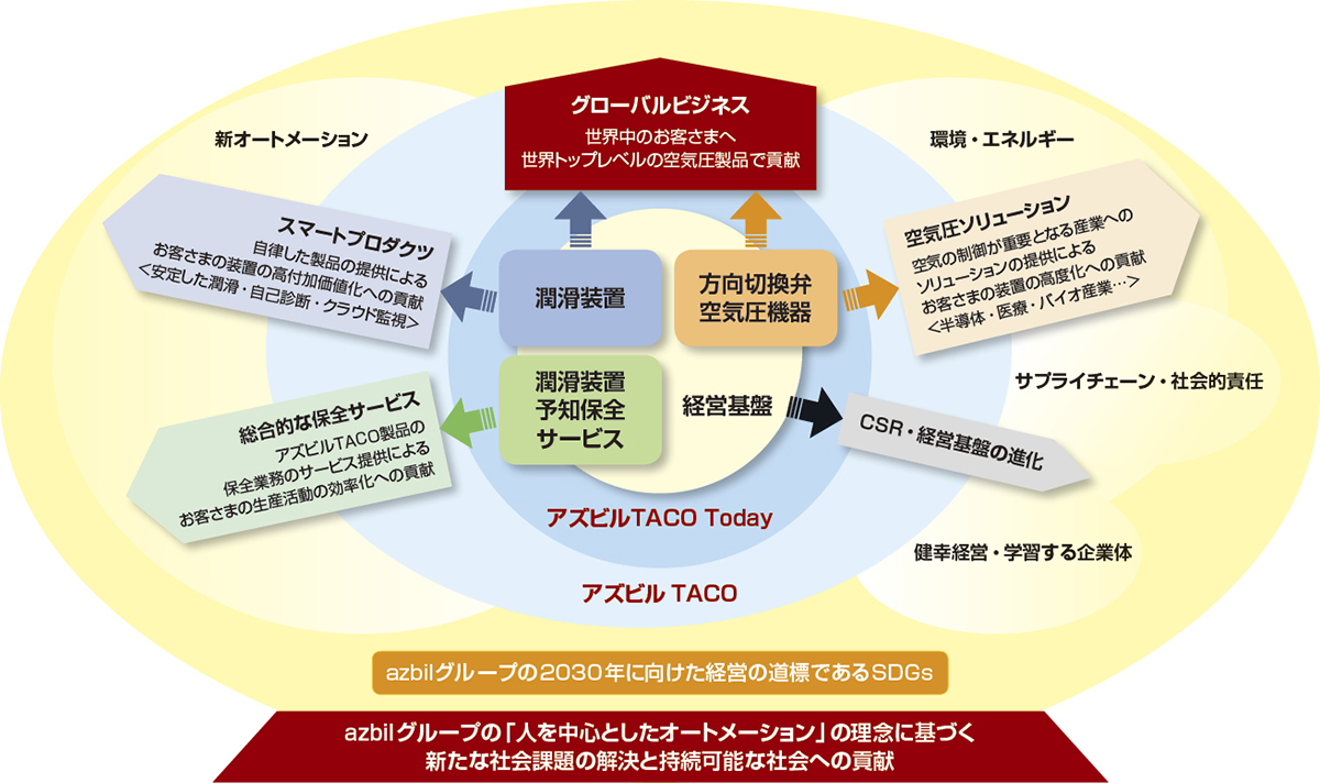 アズビルTACOは、このような製品の開発から製造、営業といった一連の業務機能をトータルに備えながらも、従業員約150人程度という小規模な陣容であるという点で、azbilグループ内でもユニークな存在です。現在azbilグループでは、持続可能な社会の実現に向け、SDGs*1を経営の重要な道標と位置付けており、「環境・エネルギー」「新オートメーション」「サプライチェーン・社会的責任」「健幸経営・学習する企業体」という四つのテーマからなる「azbilグループSDGs目標」を掲げ、人材育成も含めた事業活動全体での取組みを推進しています。これに対し同社は、小規模陣営ならではのフットワークの軽さを最大限に活かした独自のアプローチで、グループの掲げる目標に向けた取組みを行いながら、お客さま、そして社会へのさらなる貢献を果たしていこうとしています。