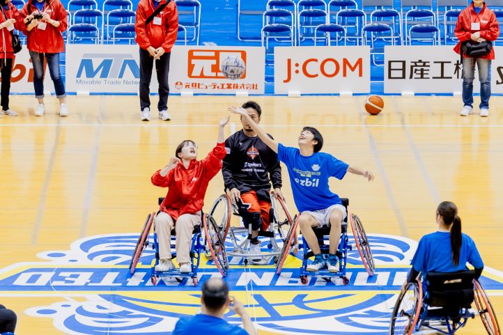 また、車いすバスケット選手を招いて、地元の子どもたちが実際に車いすに乗ってバスケットを体験する機会を提供し、これらの活動に社員もボランティアとして参加するなど、湘南ユナイテッドBCへの協賛を通じて地域貢献活動および社員参加を推進しています。
