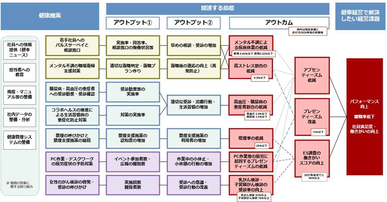 2022年度より、健幸経営で解決した経営課題と実際の取り組みとのつながりを可視化する戦略マップを作成しています。「パフォーマンス向上」「離職低下」「社員満足度の向上」という経営課題の解決のために、「アブセンティーズムの改善」「プレゼンティーズムの改善」「働きがいのスコア向上」の3つのアウトカムを設定して各種の取り組みを進めています。