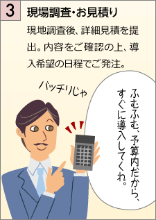 現地調査後、詳細見積を提出。内容をご確認の上、導入希望の日程でご発注。