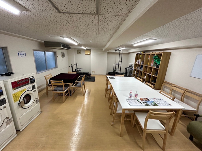 7.一階には共用スペースがあり、共同の乾燥機が設置されていました。また筋トレグッズや麻雀卓もあります。筋トレしたい人や社員同士で遊びたい人におすすめです。