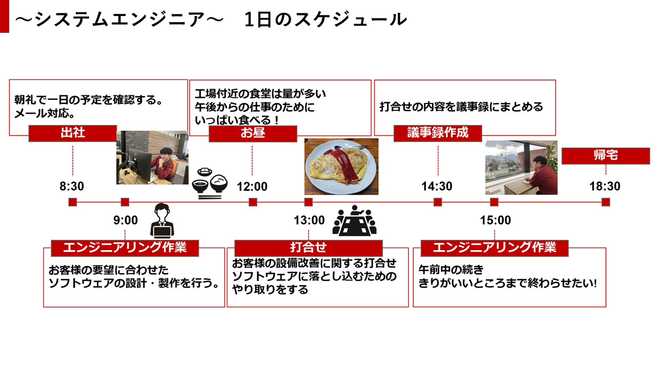 お客様の工場が止まっているタイミングでしかできない業務もあるので、長期休暇中に仕事が発生する場合もありますが、その際は振替休日得劣ることが出来ます。混雑を避けて休めるのはメリットだと思っています。そのおかげで実家に帰ったり、遊んだり、プライベートも充実しています。