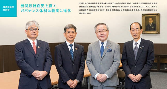 2022年の指名委員会等設置会社への移行から3年が経過した2025年も、社外取締役の取締役会議長就任や報酬制度の改定等、ガバナンス体制の強化に向けた取組みを継続しています。統合報告書azbilレポート2025では、これまでの振返りや今後の展開について、取締役会議長および各委員会の委員長の4名の社外取締役にお話を伺いました。