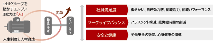 - 社員一人ひとりが社会課題解決に向け考え行動し、成長し続ける「企業風土の醸成」と、社員一人ひとりが様々なステークホルダーと連携して活動に参加することにより、azbilグループとしての連帯感と達成感の実現を目指します。