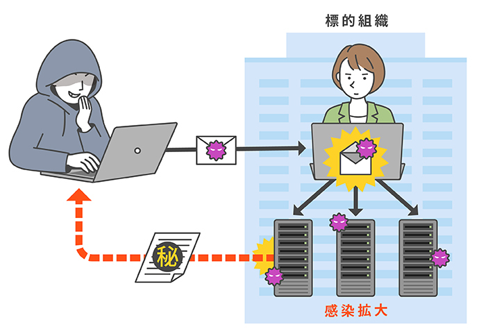 企業や官公庁など特定の組織を対象に、機密情報の窃取(せっしゅ)や営業妨害を目的に行われるサイバー攻撃を標的型攻撃といいます。攻撃者はPCやサーバへ不正アクセスやマルウェアを利用した侵入などを行い、情報の窃取やシステムの破壊活動を実行します。