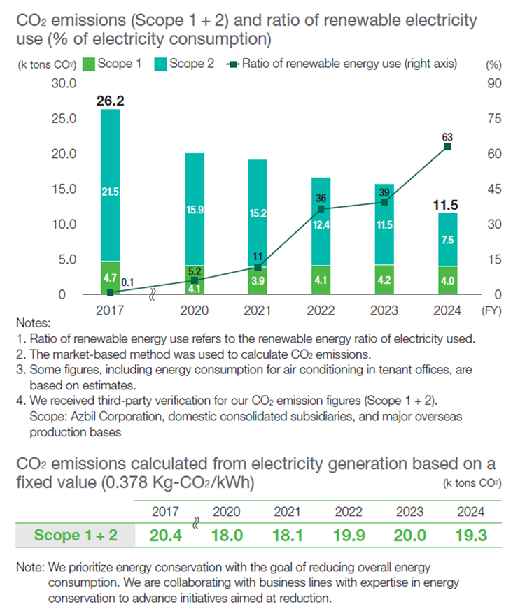 CO2 emissions from our own business activities (Scope 1 and 2) in FY2024 were 11 thousand metric tons (a 56% reduction from FY2017), achieving the FY2030 target ahead of plan.