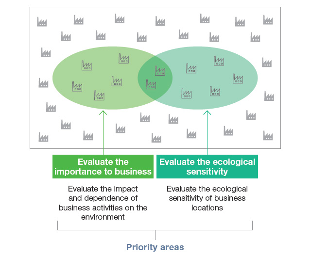 There are two methods for identifying priority sites: one method evaluates the magnitude of impact and dependence of business activities on the environment, and the other evaluates the ecological sensitivity of business sites. Through these two methods, the upstream of the azbil Group has identified 27 business partner locations.