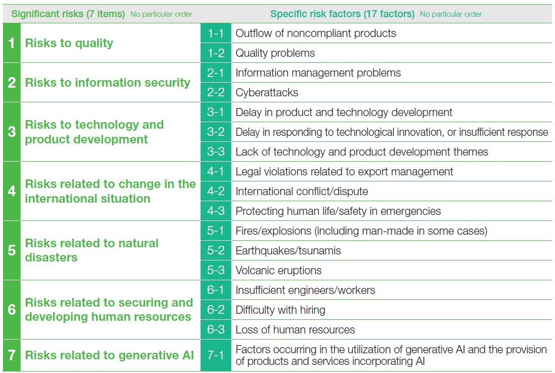 Significant risks that could severely affect the business results and financial position of the azbil Group are summarized below. Of the 121 risks comprehensively identified, we selected 17 as significant risks, and summarized these into seven items. The significant risks indicated below and the specific risk factors are judged by Azbil to be valid as of the end of FY2024. Details on risk awareness and concrete risk countermeasures for significant risks are found in the 103rd Securities Report.