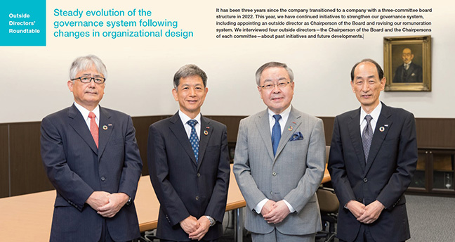 It has been three years since the company transitioned to a company with a three-committee board structure in 2022. This year, we have continued initiatives to strengthen our governance system, including appointing an outside director as Chairperson of the Board and revising our remuneration system. We interviewed four outside directors—the Chairperson of the Board and the Chairpersons of each committee—about past initiatives and future developments.