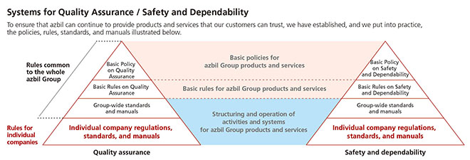 The azbil Group ensures the provision of safe and dependable products and services worldwide by setting out clear rules for employees in the "azbil Group Basic Quality Policy" and "azbil Group Basic Policy on the Safety and Dependability of Products and Services" and by having Group companies formulate detailed rules and standards for maintaining the quality, safety, and dependability of their products and services.
